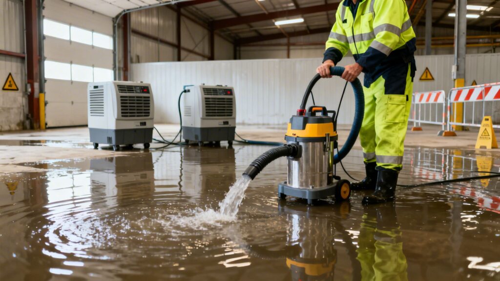 Når et sprunget rør eller et skybrud pludselig sætter et stort erhvervsgulv under vand, er en hurtig og professionel indsats altafgørende for at begrænse skaderne